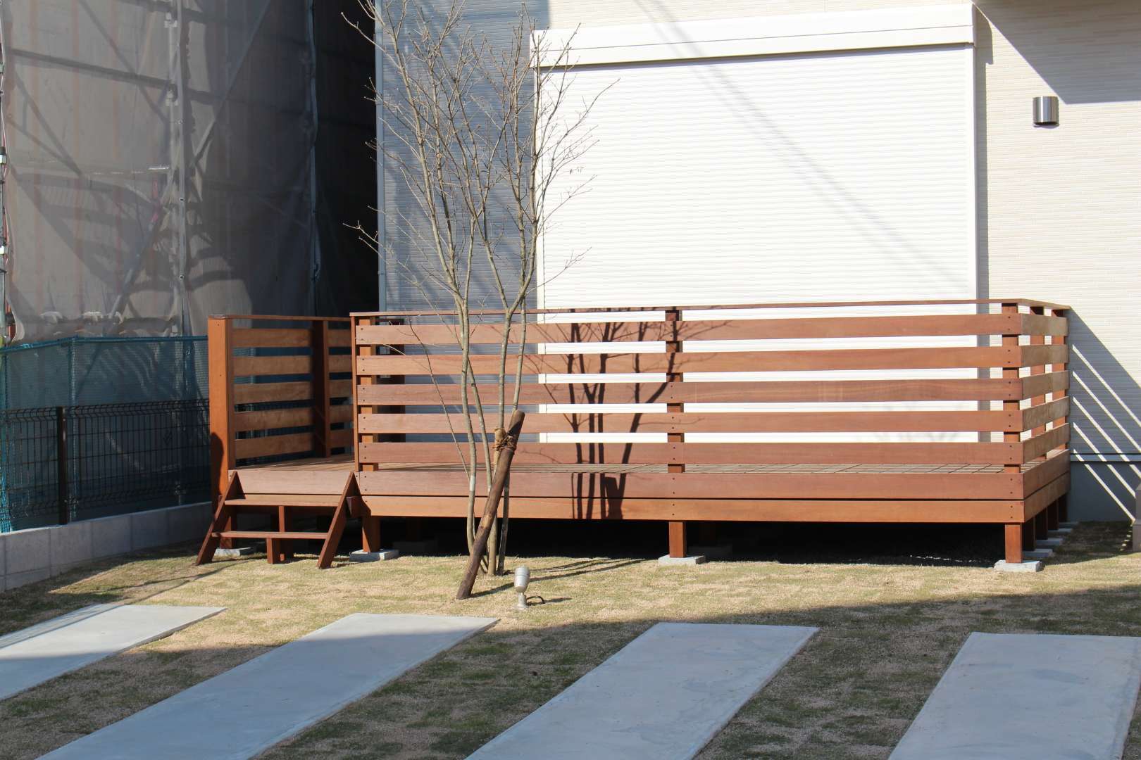 三木市K様邸にウッドデッキを設置しました。こちらのデッキにはウリンを使用。ウリンはインドネシア、マレーシア原産の超硬質木材で、耐候性、耐久性が高く、塗装をしなくても腐らないため、メンテナンスの必要がなく、ウッドデッキにはお勧めの木材です。 デメリットは、ウリンにはポリフェノールが含まれており雨が降ると樹液とともに流れ出し、回りや、下地を汚してしまします。しかし数か月で流れでてしまうので最初だけ我慢していただければあとは汚れも気にならなくなります。どうしても気になる場合は汚れたところを洗剤で洗い流すことができます。