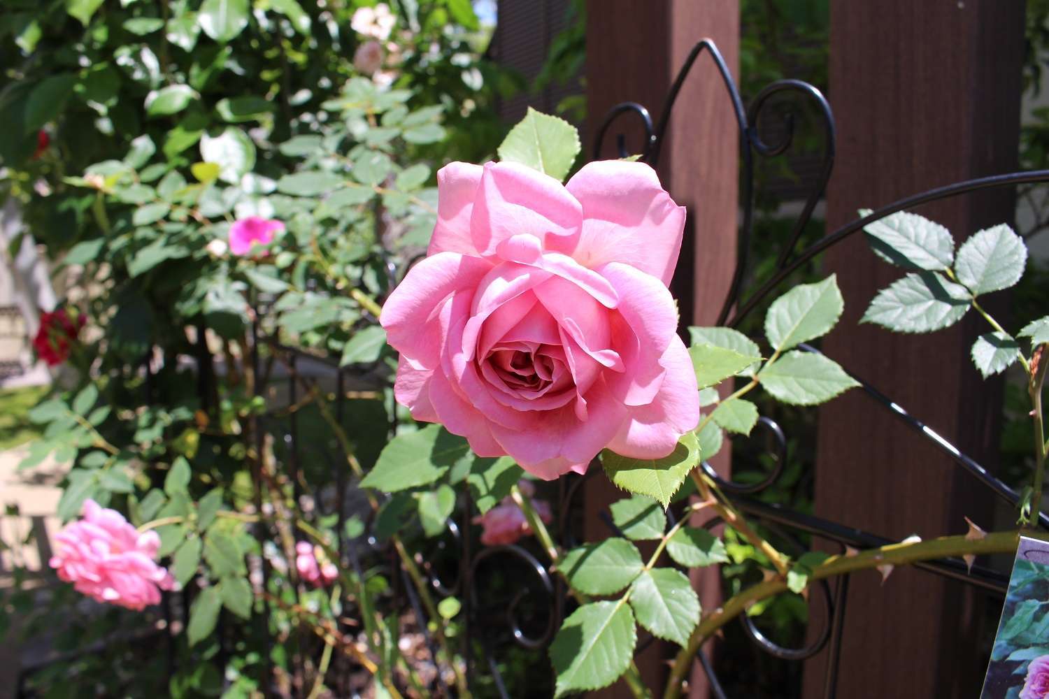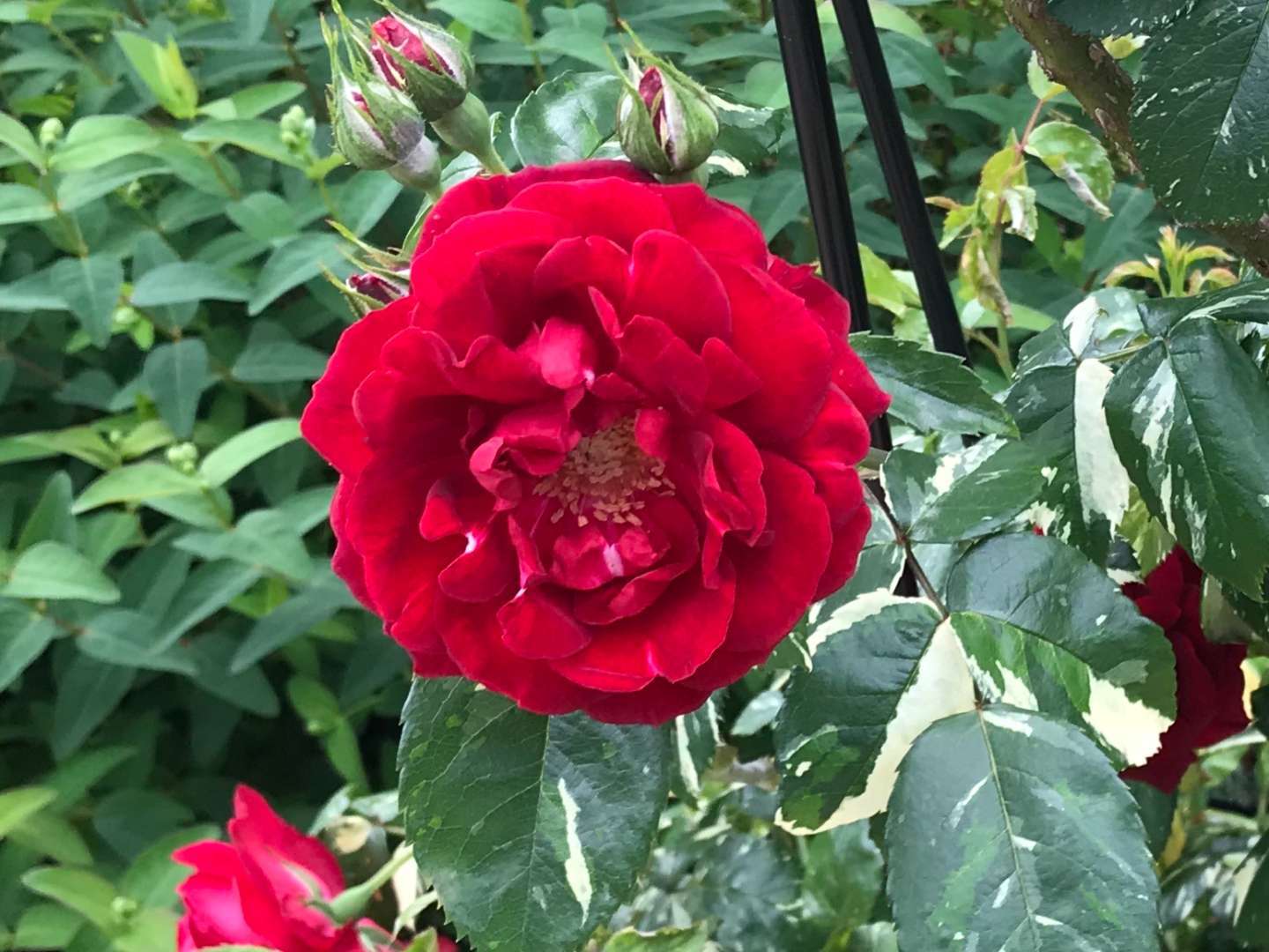 情熱の真っ赤なバライルルージュ。昨年は鉢で育てて花が咲かず、今年は直植えに。オベリスクに仕立てました。綺麗に咲いて一安心。