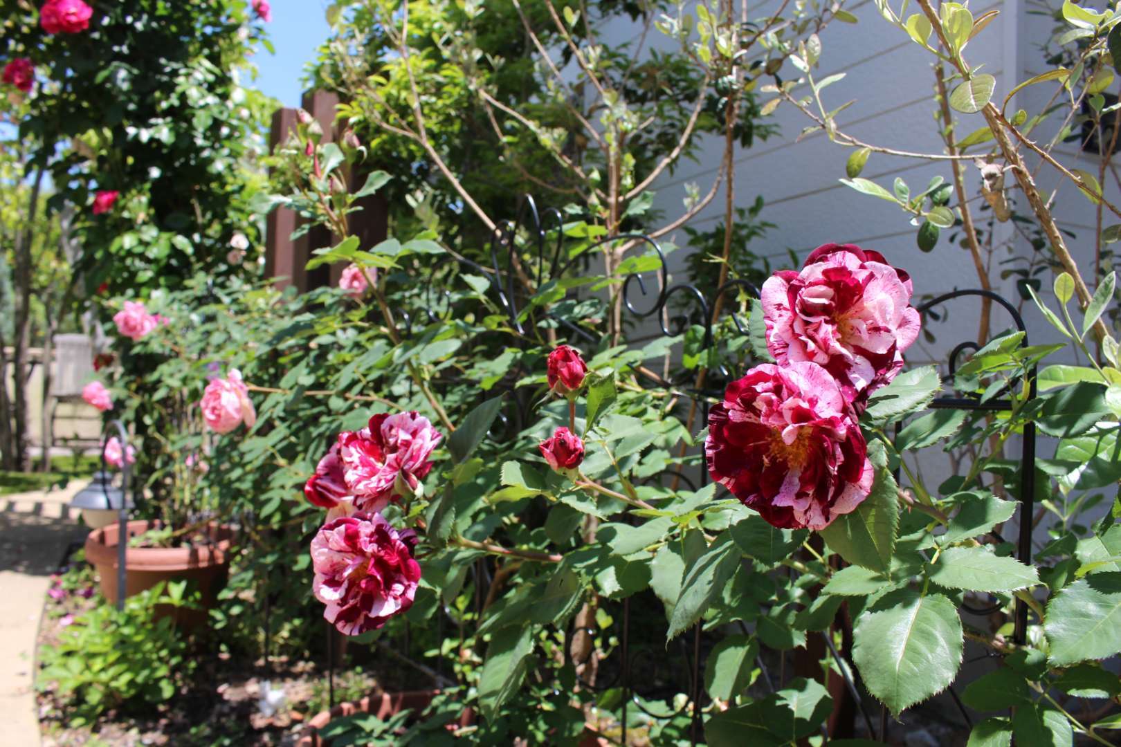 一番目を引くのがこのギーサヴォア。濃いピンクに薄いピンクの縞が入るばら。発色がよく、遠くからでも目を引きます。