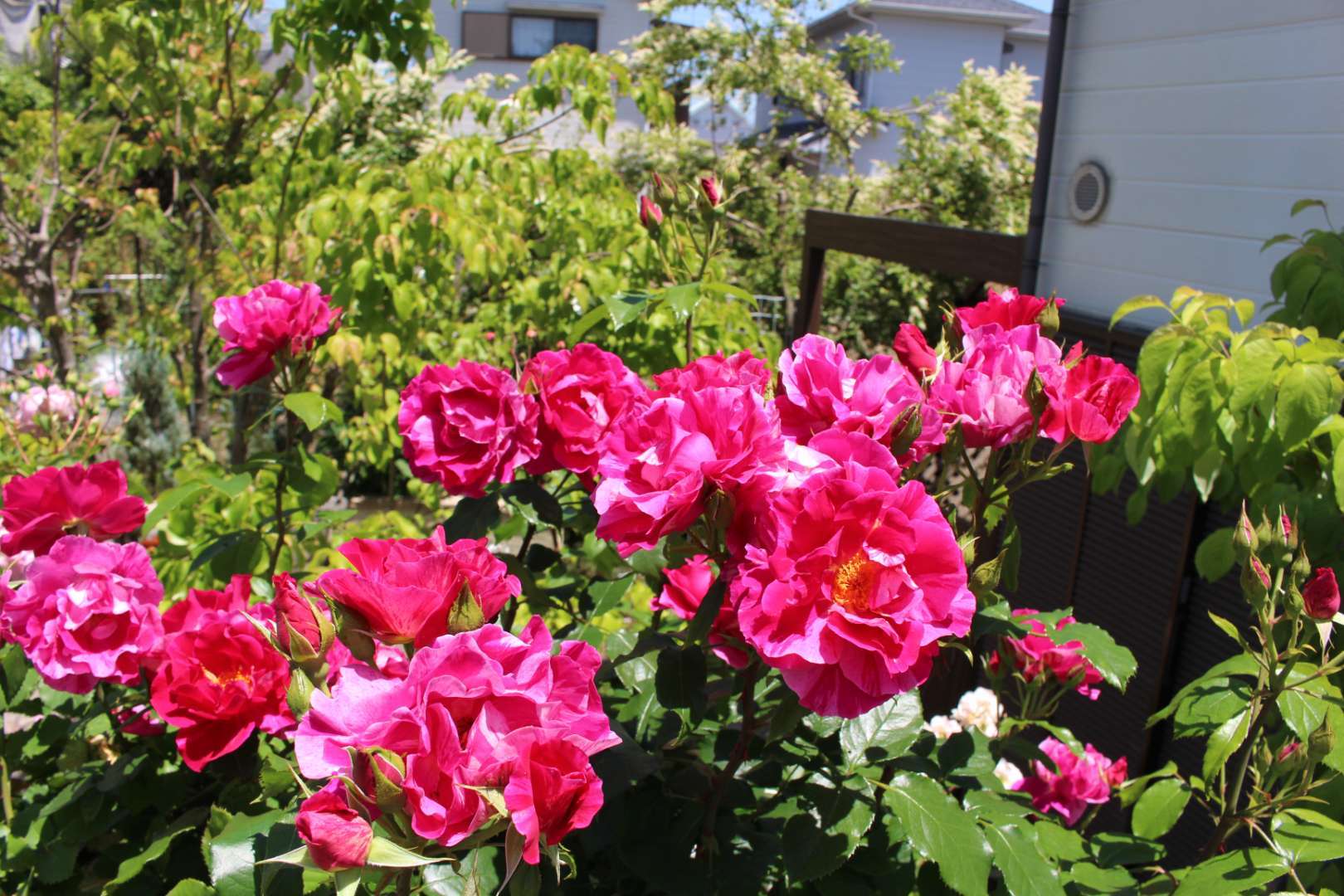 大きなピンク色の大輪バラがビヴァンヴニュ。フランス語でようこその意味だそうです。とてもいい臭いがします。小さな薄いピンクのバラがコーネリア。これも例年より色が薄いです。