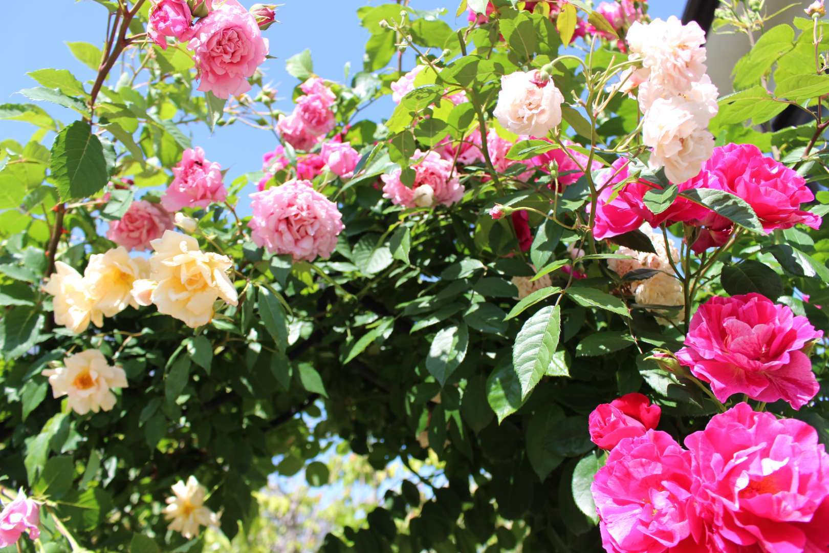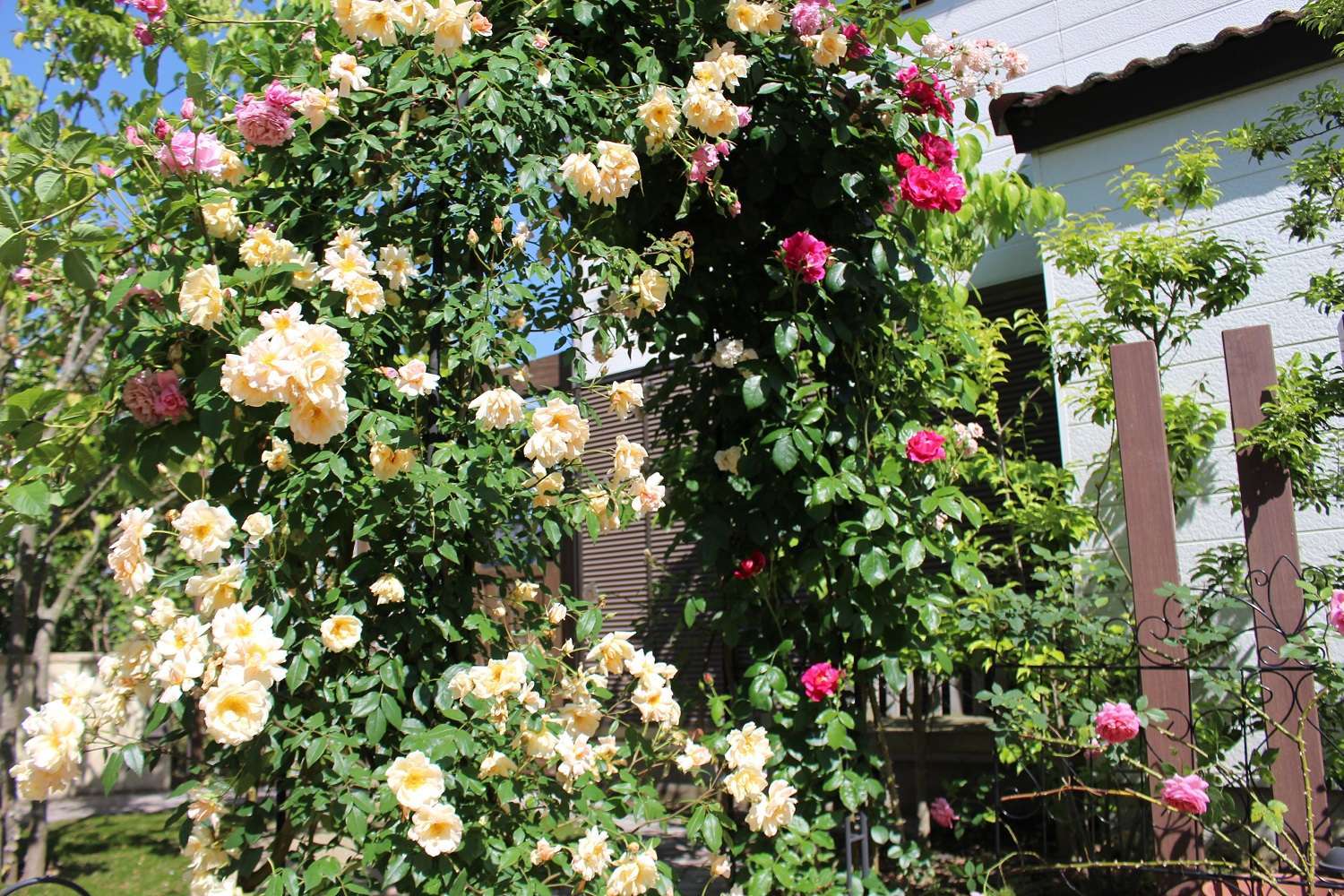 モデルガーデンのバラ。アーチに4種類のバラをかけてますが、今が一番の見ごろになりました。このアーチのバラが一番の楽しみ。去年は種類によって咲く時期にバラツキがありましたが、今年はちょうどいい感じに咲いてくれました。