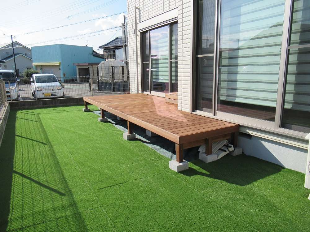 広い庭に人工芝を敷き詰めました。とてもやわらかい素材を使った人工芝で、子供様達もはだしで足りまわってるとのことです。