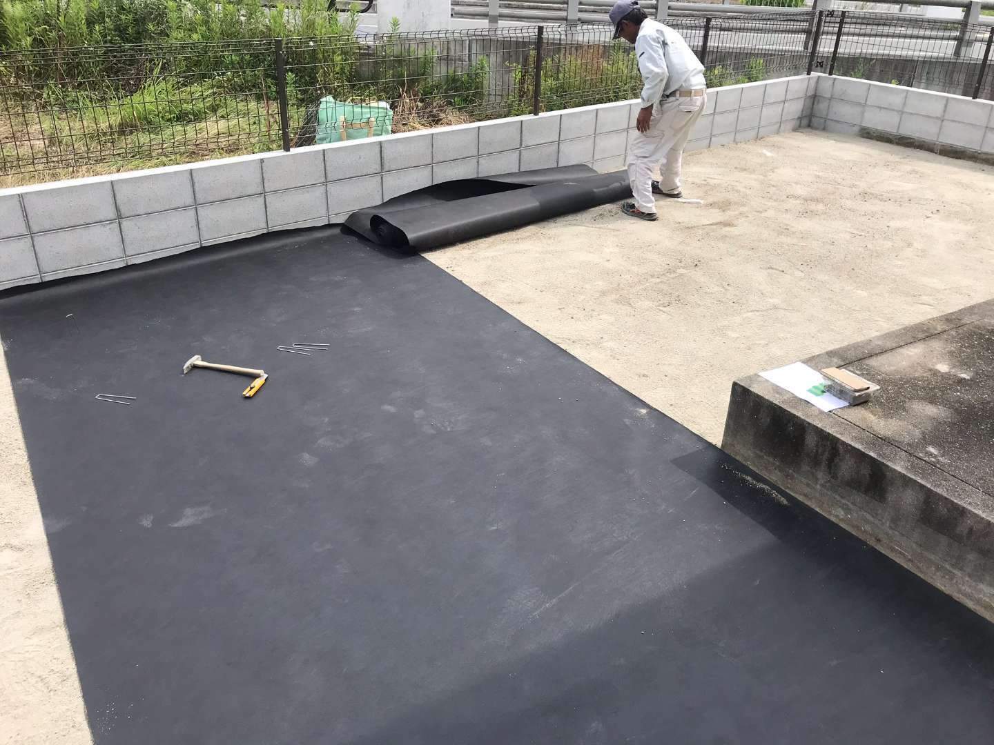 人工芝から草が生えてこないよう防草シートを貼り、この上に人工芝を貼ります。