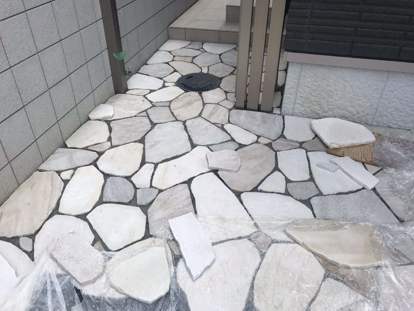 加古川市での現場の様子。アプローチに方形、乱形の天然石を貼っています。