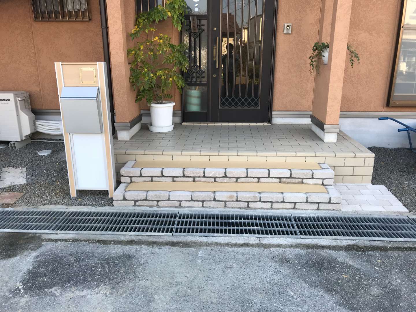 施工後。階段は既存ポーチに合わせてベージュ色のセメントレンガで。幅を広く取りどこからでも上がれるようにしました。ポストは郵便物を前からいれで後ろからとるタイプのポストにしました。