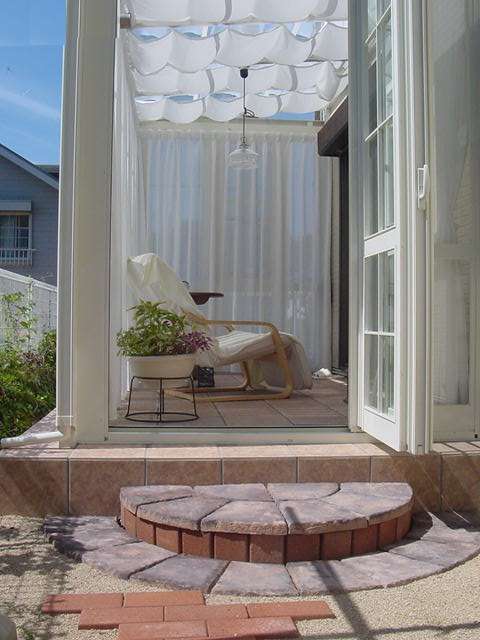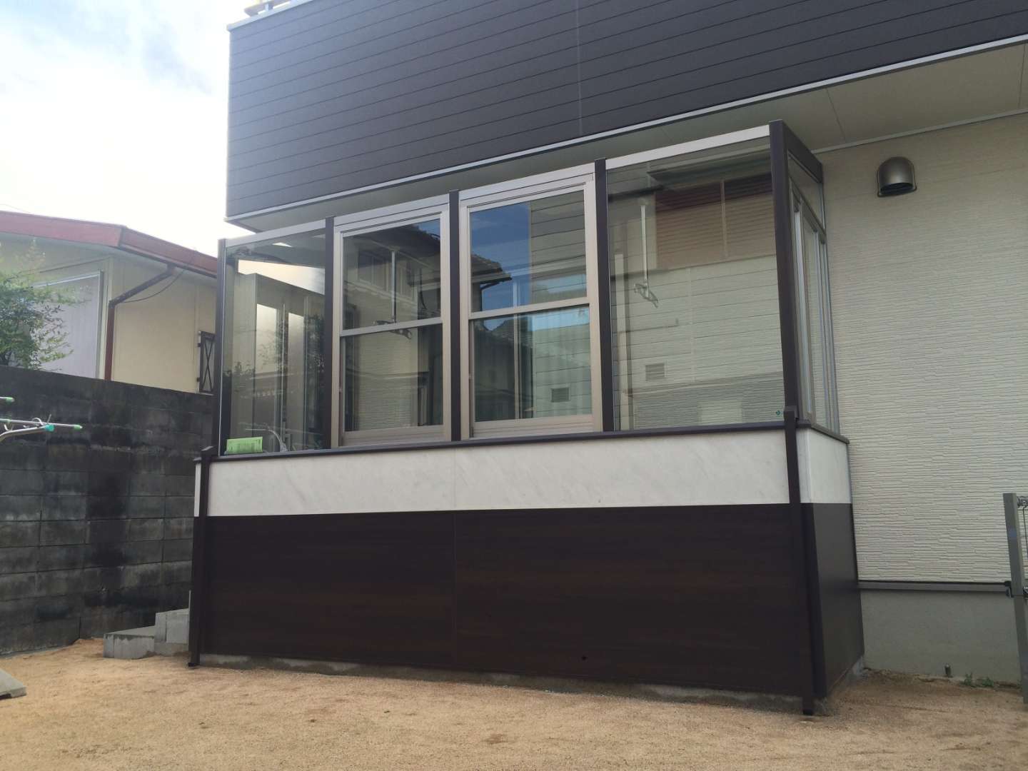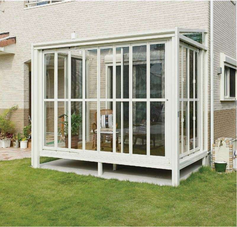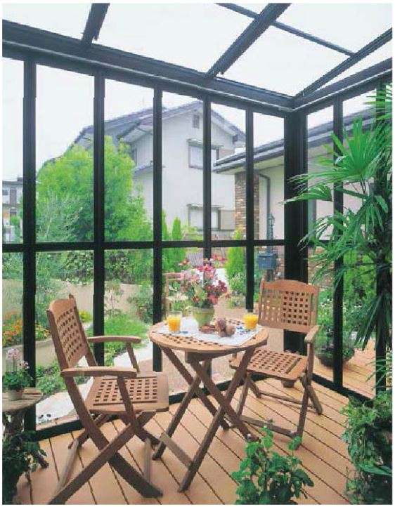 ほとんど「フルオープン」のウッドデッキやテラスとは違って、屋根にはしっかりとした採光ルーフ、壁面はガラスの折れ戸やガラスパネル、窓のついた腰壁などで囲まれていて、場所こそ屋外には突き出ていますが、より「部屋」に近い感じになります。