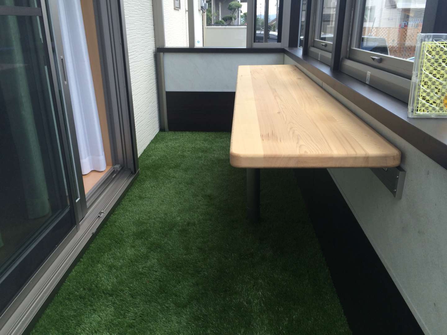 子供が自由に遊べるように床に人工芝、腰壁には折りたたみ式のカウンターテーブルを導入しました