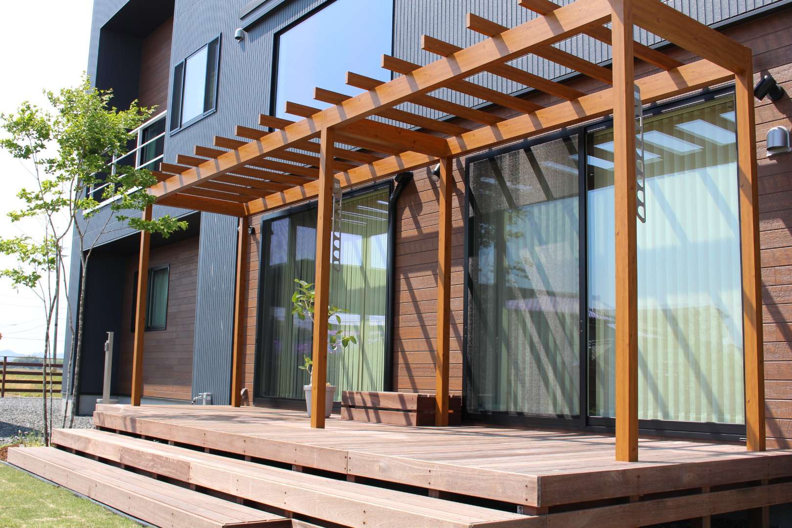 パーゴラはタカショーさんのパーゴラポーチ。アルミ製ですが見た目は本物の木そのもの。デッキは最強の木ウリンを使用。温かみのある質感がいいですね。