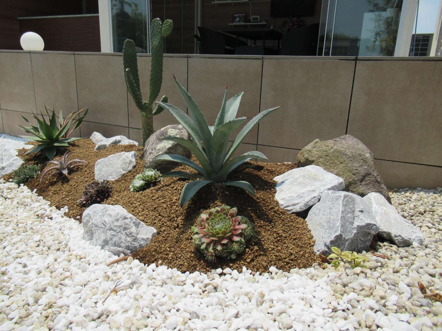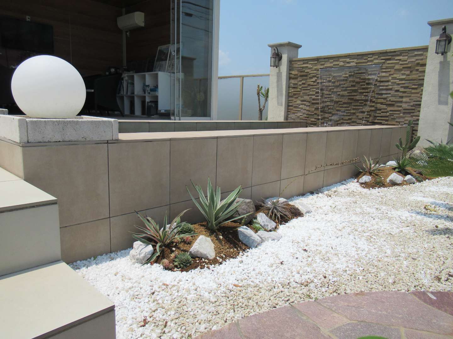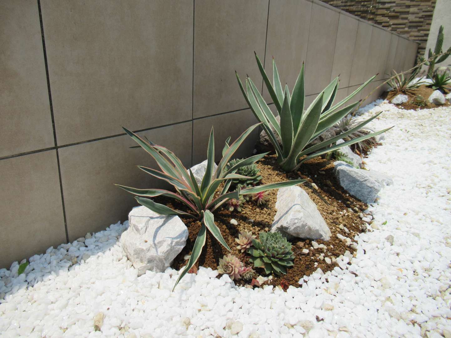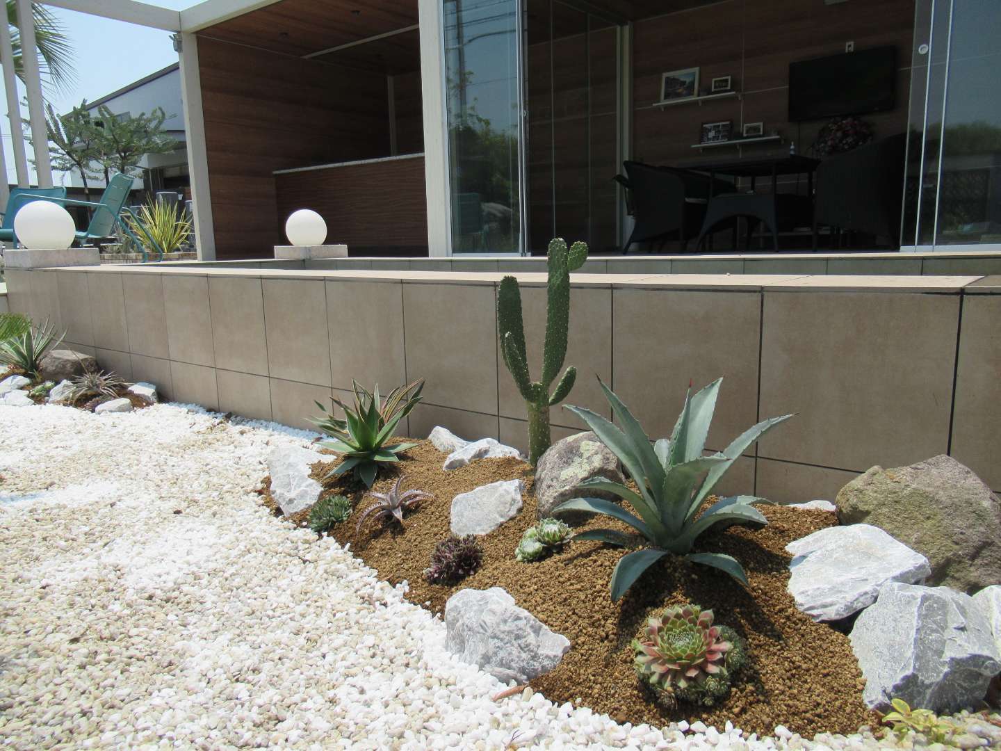 モデルガーデンの壁泉のすぐ横にアガベを中心にサボテン、多肉植物を使って