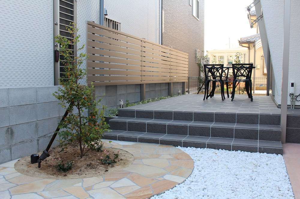 タカショーさんの目隠しフェンスセンシアで目隠しをし、タイルテラスを設置。天気のいい日はテラスで家族だんらんのひとときを過ごします。