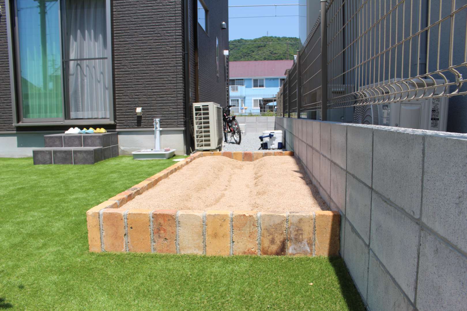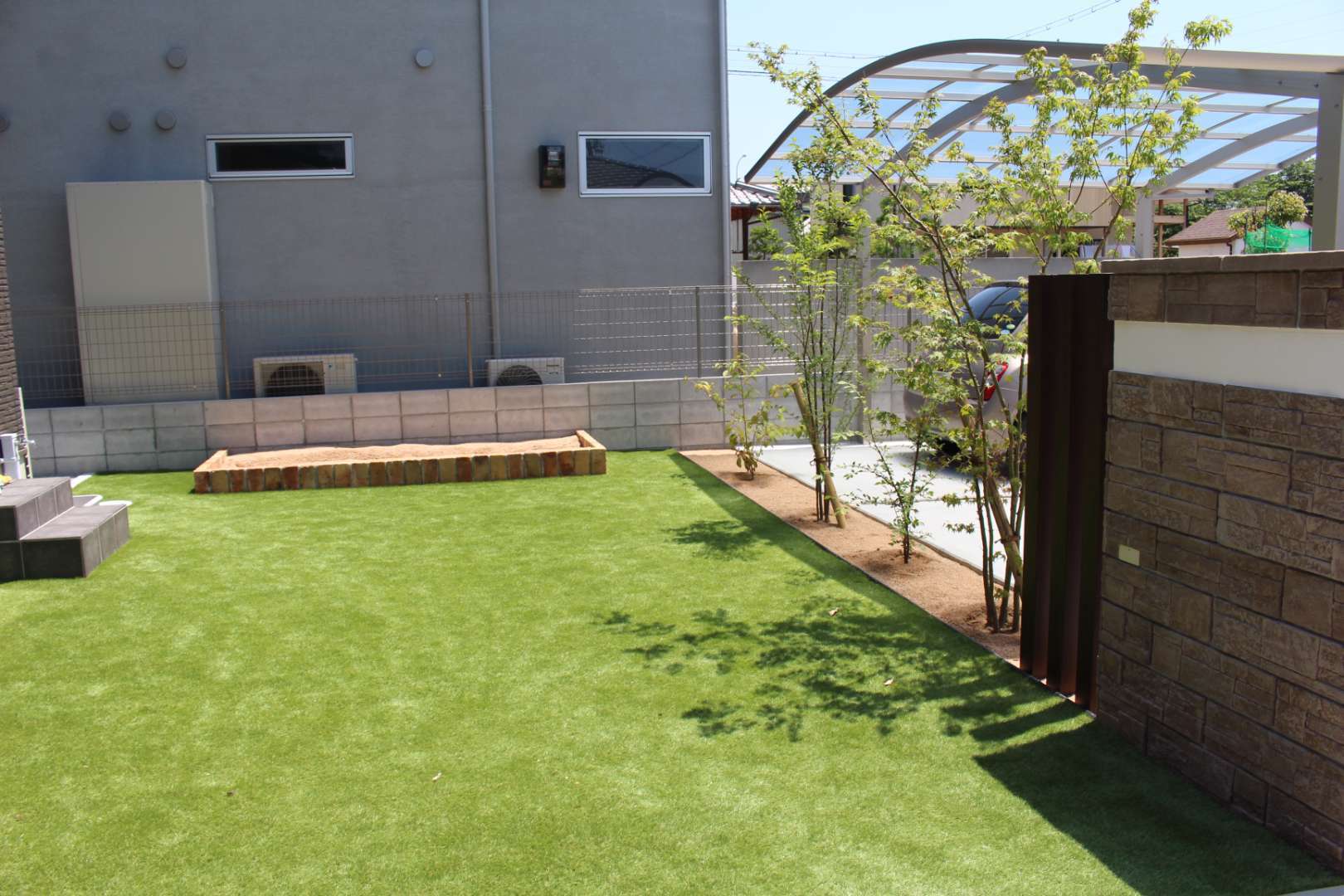 I様のご要望は庭に人工芝を敷いて子供さんが庭で楽しめるペースを作りたいとのご要望でした。