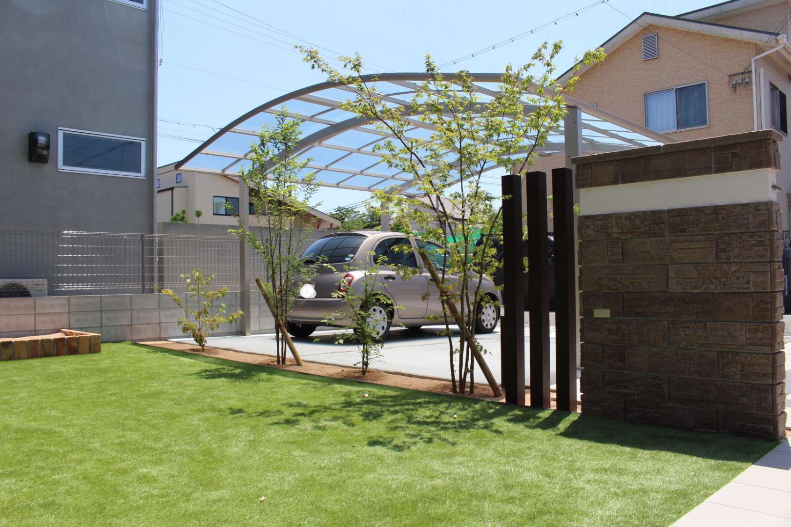 レンガ花壇では家庭菜園をされる予定です。駐車場と人工芝の仕切りに季節を感じる木を植えました。モミジ、ニシキギ、エゴ、オオデマリを植えました🌼モミジとニシキギは紅葉がきれいで、エゴは五月ごろにかわいい花をつけます。オオデマリは5~6月ごろに大きなボール状の花を咲かせます。モミジもエゴも落葉樹なので大きくなると夏は木陰を作り、冬は日差しが入りこみます。真夏も真冬も庭で過ごせます^^