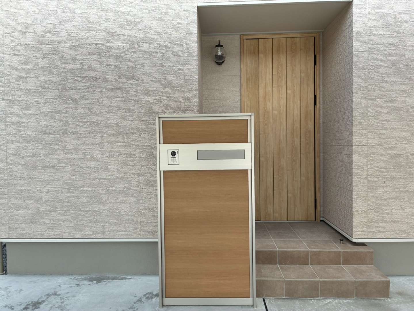 木調カラーが建物と統一感を生み、ナチュラルでおしゃれな玄関まわりに仕上がりました🏡